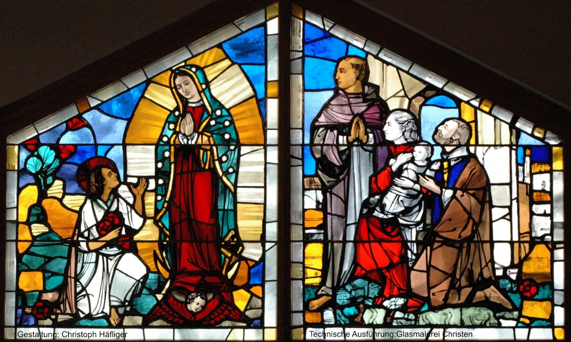 Als erfahrene Glasmaler realisieren wir Entwürfe von spezialisierten Künstlern wie zum Beispiel dieses Kirchenfenster von Christoph Häfliger oder führen als Kunstglaser eigene Entwürfe auf Basis von Kundenwünschen aus.